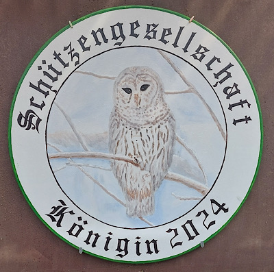 Die Schützenkönigin darf sich ihr Scheibenmotiv aussuchen und bekommt sie im Folgejahr überreicht. Daher ist oben die Scheibe der Königin des Vorjahres abgebildet.